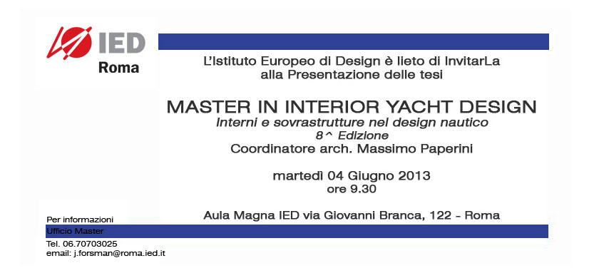 Giugno 2013. Martedì 4 giugno 2013 si terrà presso la sede IED master di via Branca 122 a Roma, la giornata conclusiva di presentazione delle tesi finali degli studenti della ottava edizione del Master in Interior Yacht Design.